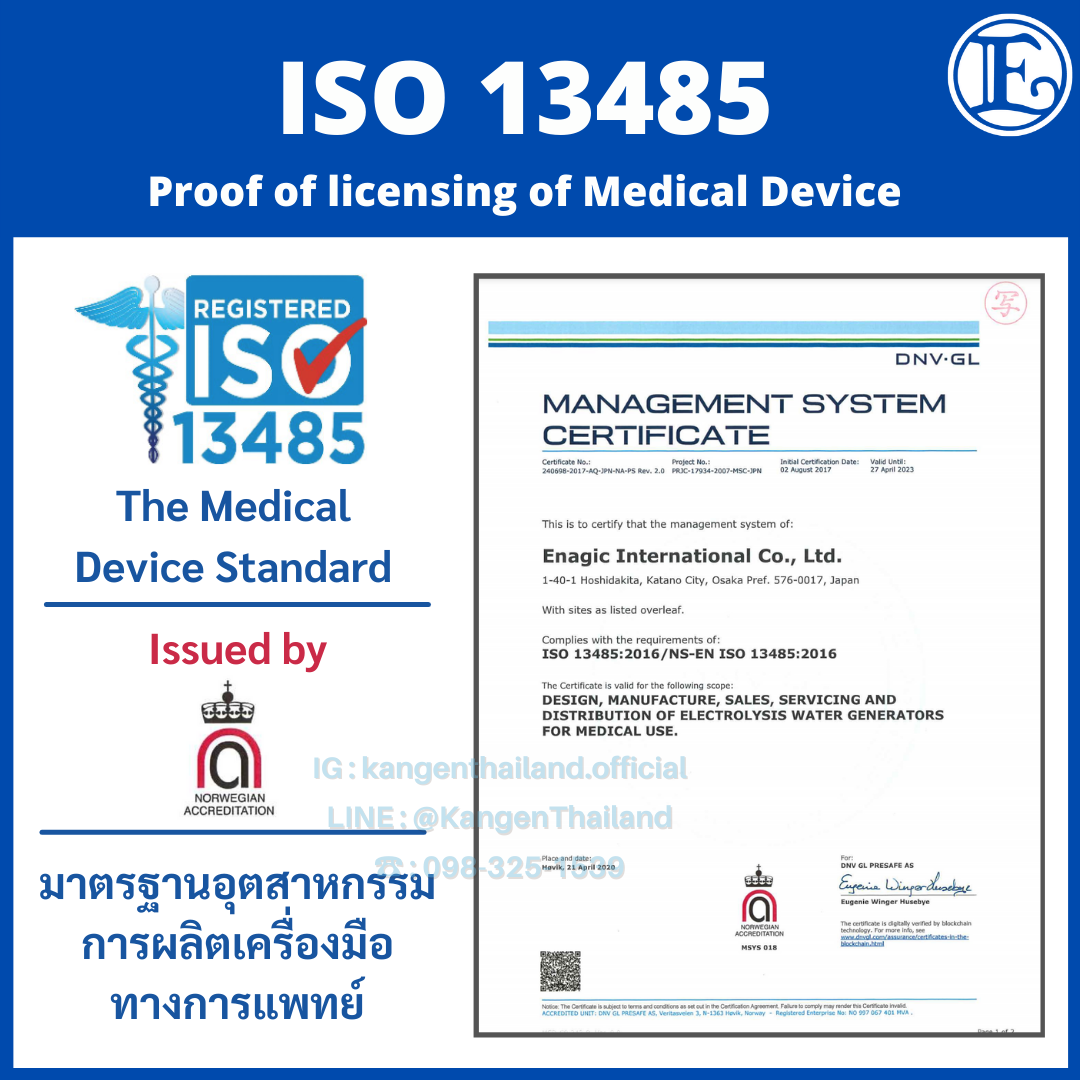 และทางโรงงาน ก็ยังได้รับใบรับรองการผลิต ในระดับการผลิตเครื่องมือแพทย์อีกด้วย โรงงานของ Enagic มีสินค้าหลักชนิดเดียวคือ เครื่องผลิตน้ำด้วยระบบอิเล็กโทรไลซีส (Electrolysis Water Generator for General and Medical Used) ท่านจึงสามารถมั่นใจได้ว่า เครื่องผลิตน้ำ Kangen Water เป็นเครื่องผลิตน้ำดื่ม (และน้ำใช้) ระดับ Medical Device อย่างแท้จริง