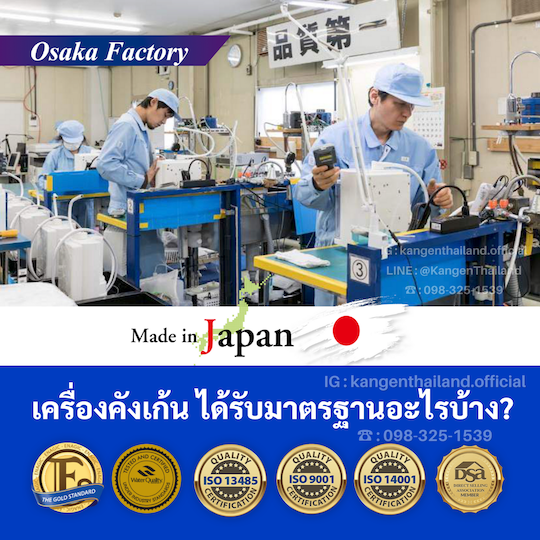 นอกเหนือจากมาตรฐานรับรองการจำหน่ายเครื่องมือแพทย์แล้ว เครื่องผลิตน้ำ Kangen Water ทุกเครื่อง ผลิตจากโรงงานของบริษัท Enagic ซึ่งตั้งอยู่ที่เมืองโอซาก้า เมืองอุตสาหกรรมที่ใหญ่ที่สุดในประเทศญี่ปุ่น ท่านสามารถมั่นใจได้ว่า ทีมพัฒนา วิศวกรทุกท่านในโรงงานของ Enagic มีประสบการณ์ในการผลิต และ ออกแบบที่สูงมาก
