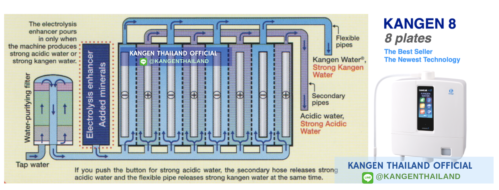 เครื่อง Kangen8 นี้ จะมีแผ่นเพลต ทั้งหมด 8 เพลต และทั้ง 8 เพลตนี้ มีหน้าที่ในการผลิตน้ำทุกประเภททำให้น้ำชนิดต่างๆ มีคุณสมบัติที่เหนือกว่า เครื่องผลิตน้ำในทุกๆรุ่น