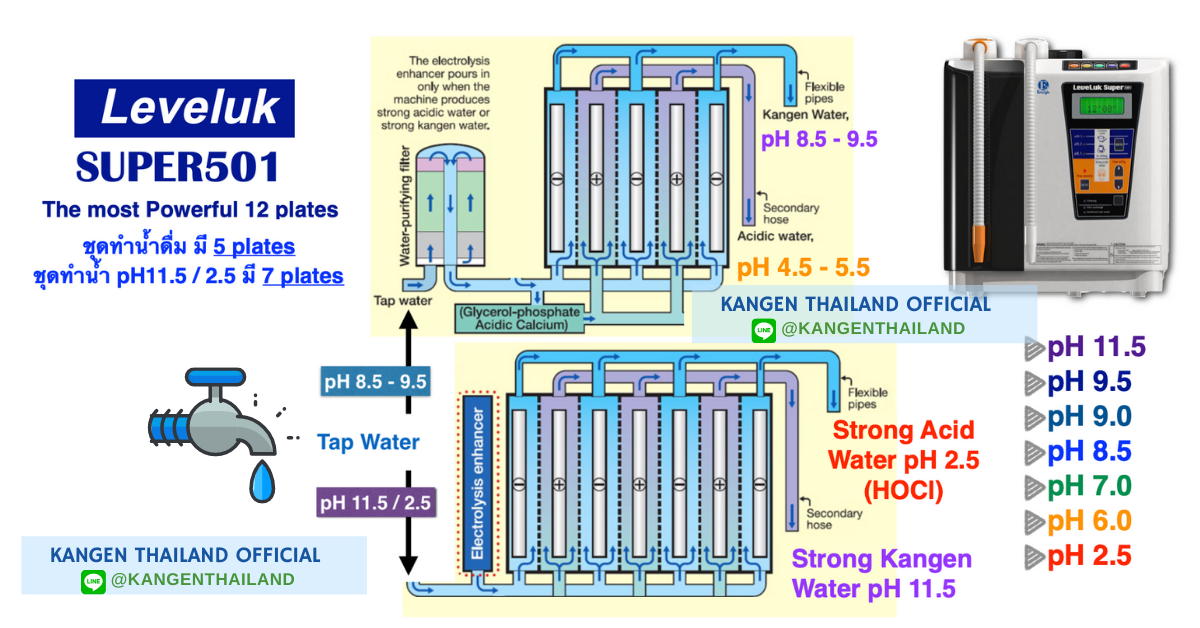 เครื่องรุ่นนี้ จะมีแผ่นเพลตทั้งหมด 12 เพลตในเครื่องเดียวกัน แต่ไม่ได้ใช้ทั้ง 12 เพลตนี้ในการผลิตน้ำทุกประเภทเหมือนรุ่น Kangen8 แต่รุ่น Super501 จะแยกแผ่นเพลตออกเป็น 2 ชุด ชุดที่หนึ่ง มี 5 แผ่นเพลต และ ชุดที่สอง มี 7แผ่นเพลต