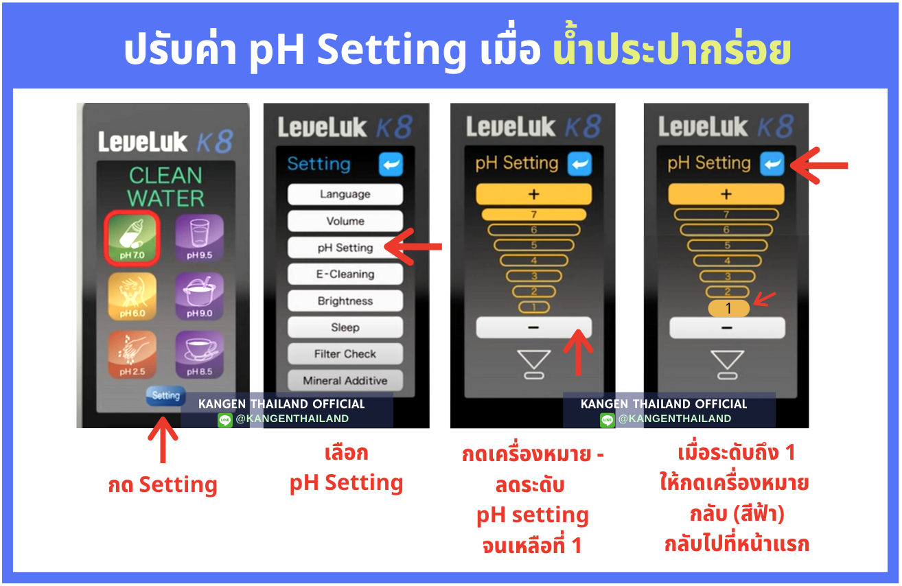2. สำหรับเครื่องทุกรุ่น SD501, Super501, และ Kangen8 ให้เลือก Mode น้ำดื่ม เป็นค่า pH 8.5 หรือ pH 7.0 น้ำดื่มที่ได้ จะมีความเค็มที่ลดน้อยลง